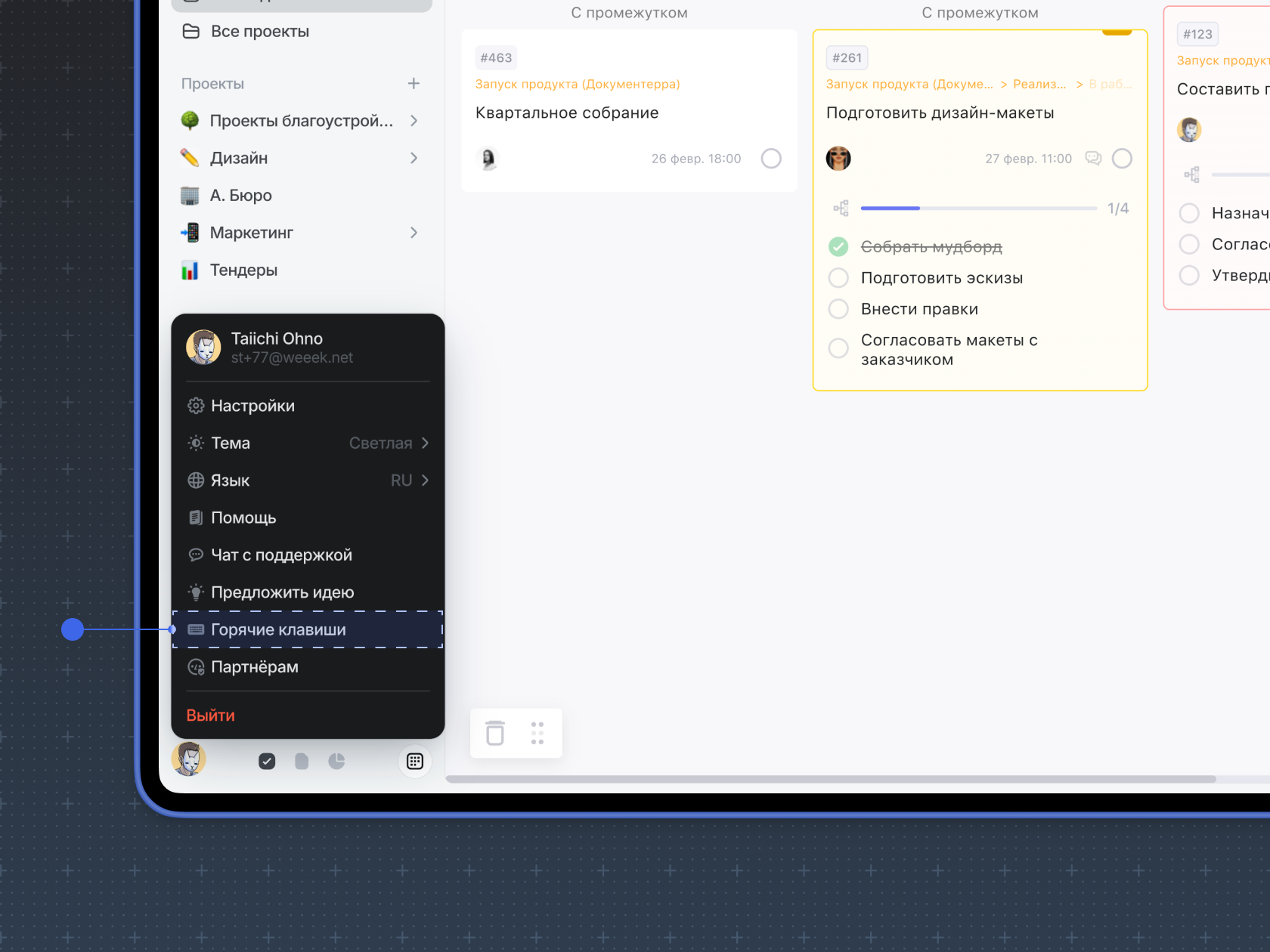 | Удалить задачу | Ctrl + Del | ⌘ + Del |