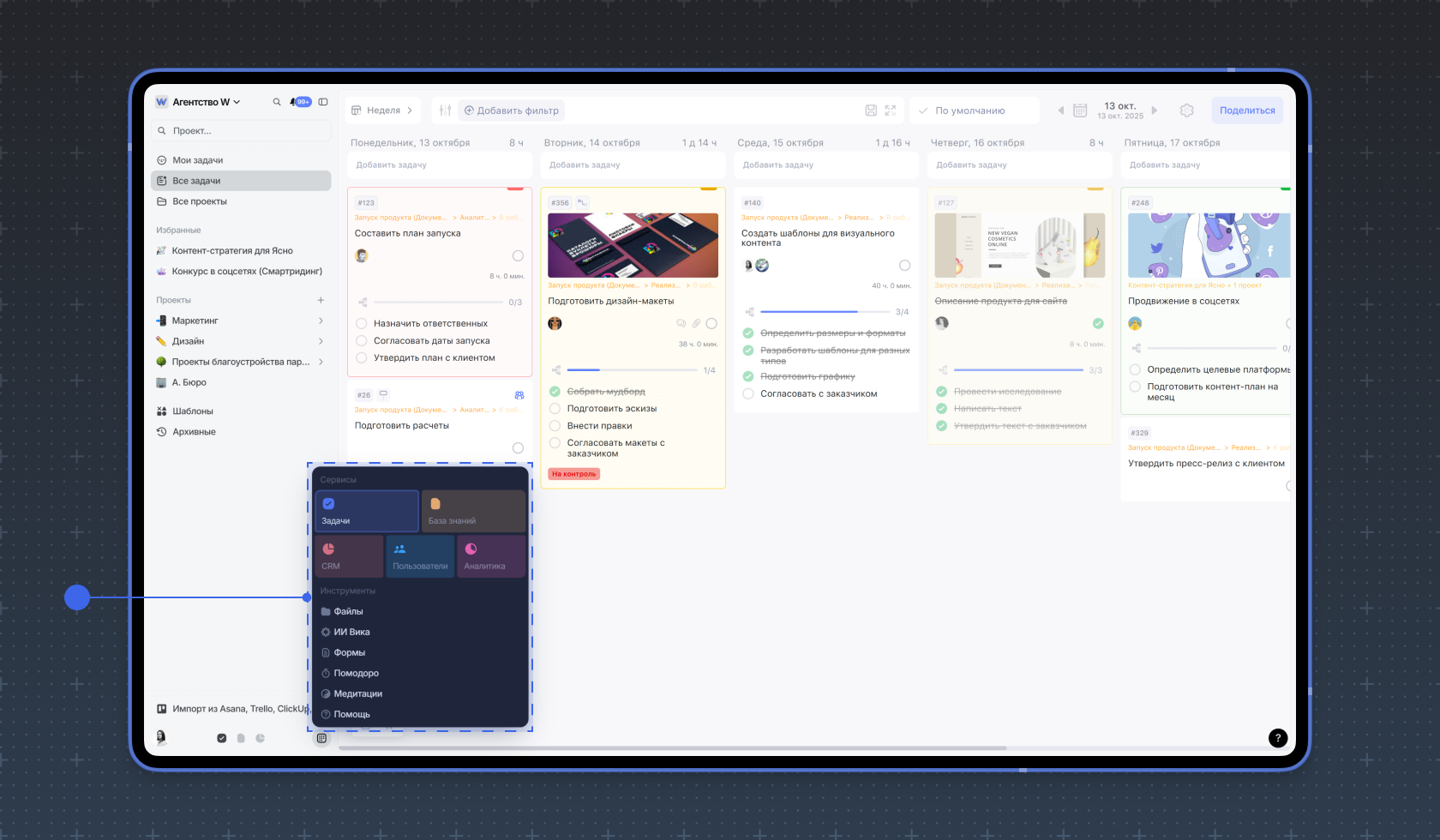 В каждом рабочем пространстве можно переключаться между сервисами: Задачи, База знаний, СRМ, Аналитика, Пользователи.