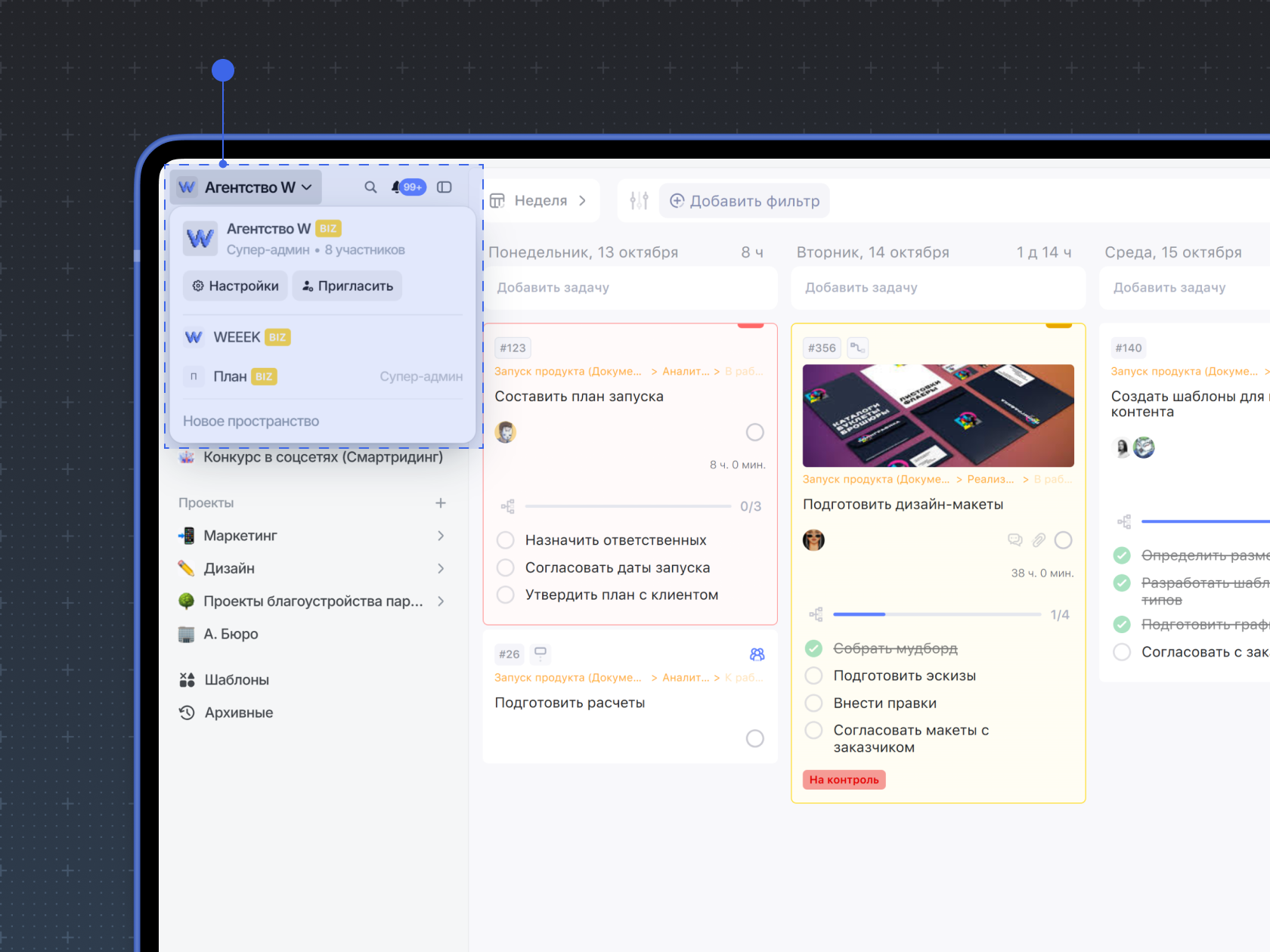 Каждое рабочее пространство в WEEEK — это отдельная сущность со своими проектами, задачами, документами, сделками и командой.